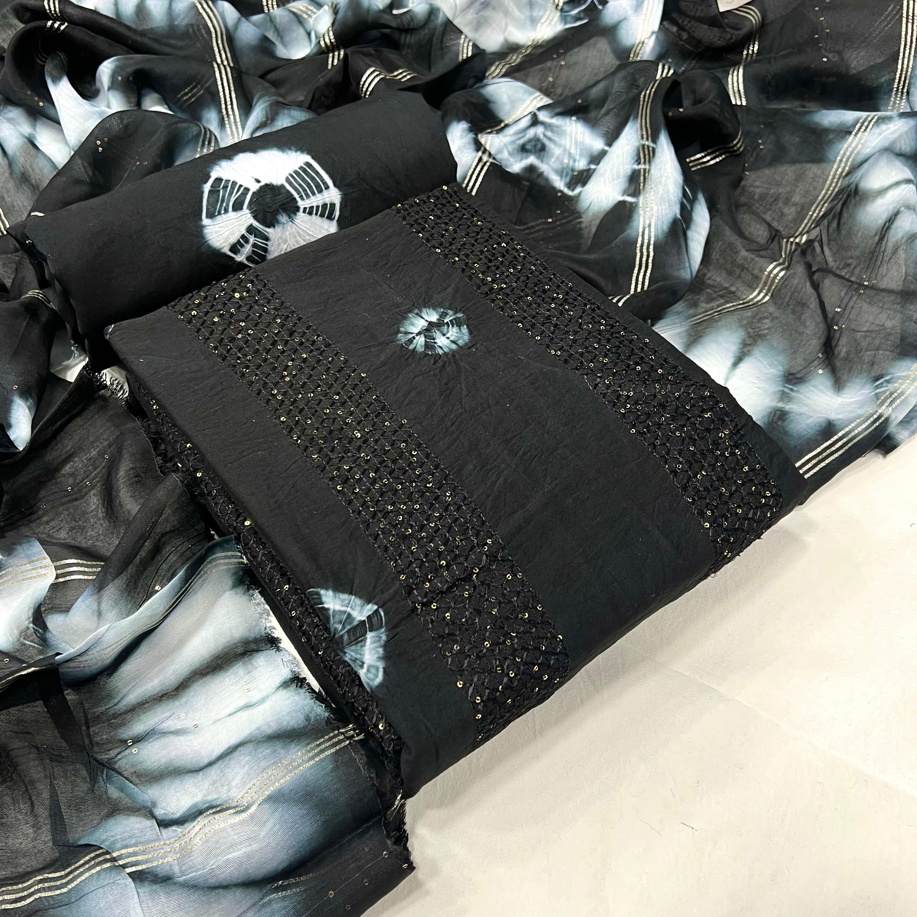 KT MAHARANI Black Pure viscose Cotton Bandhni sequence work Dress Materail has been successfully added to your cart .