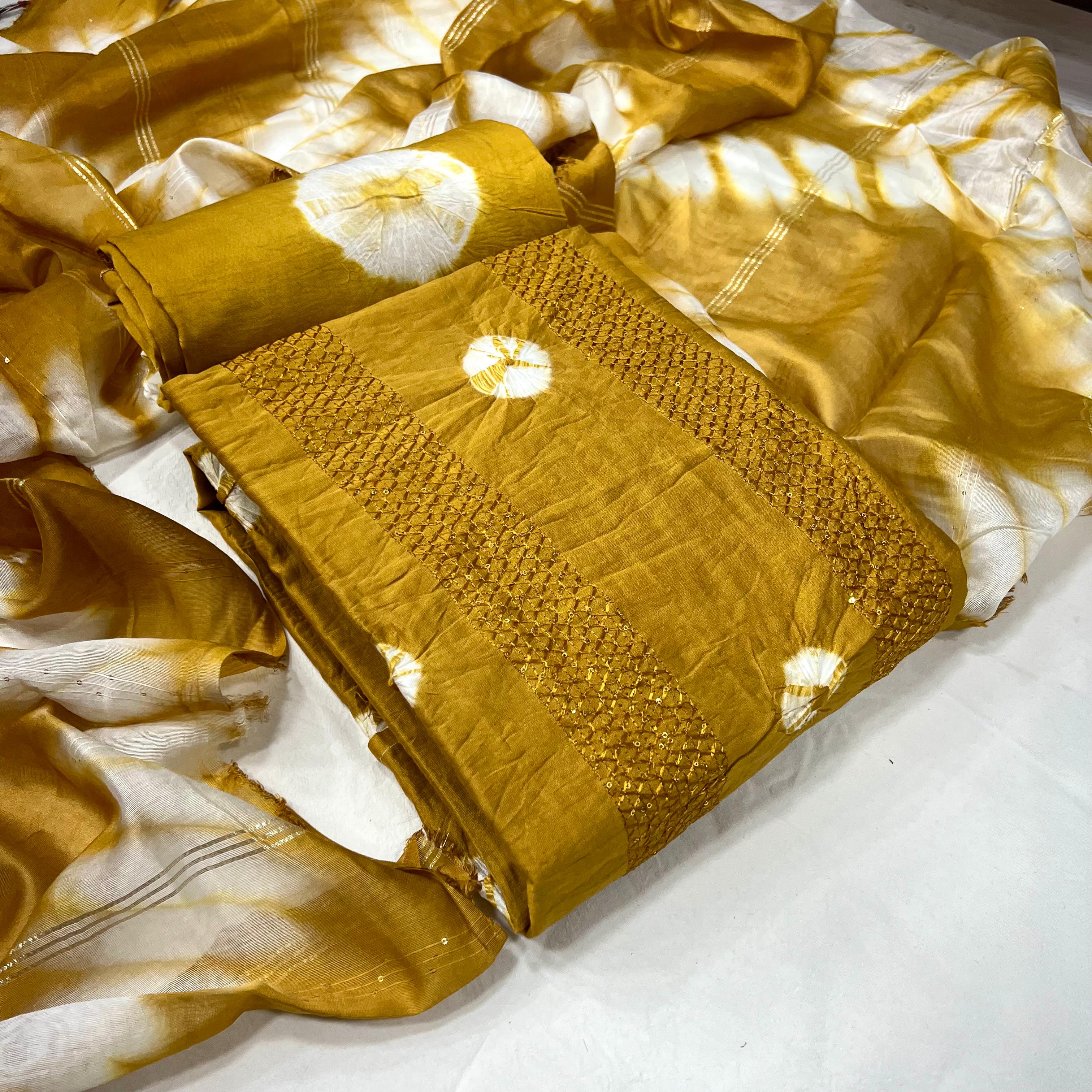 Name : KT MAHARANI Mustard Pure viscose Cotton Bandhni sequence work Dress Materail