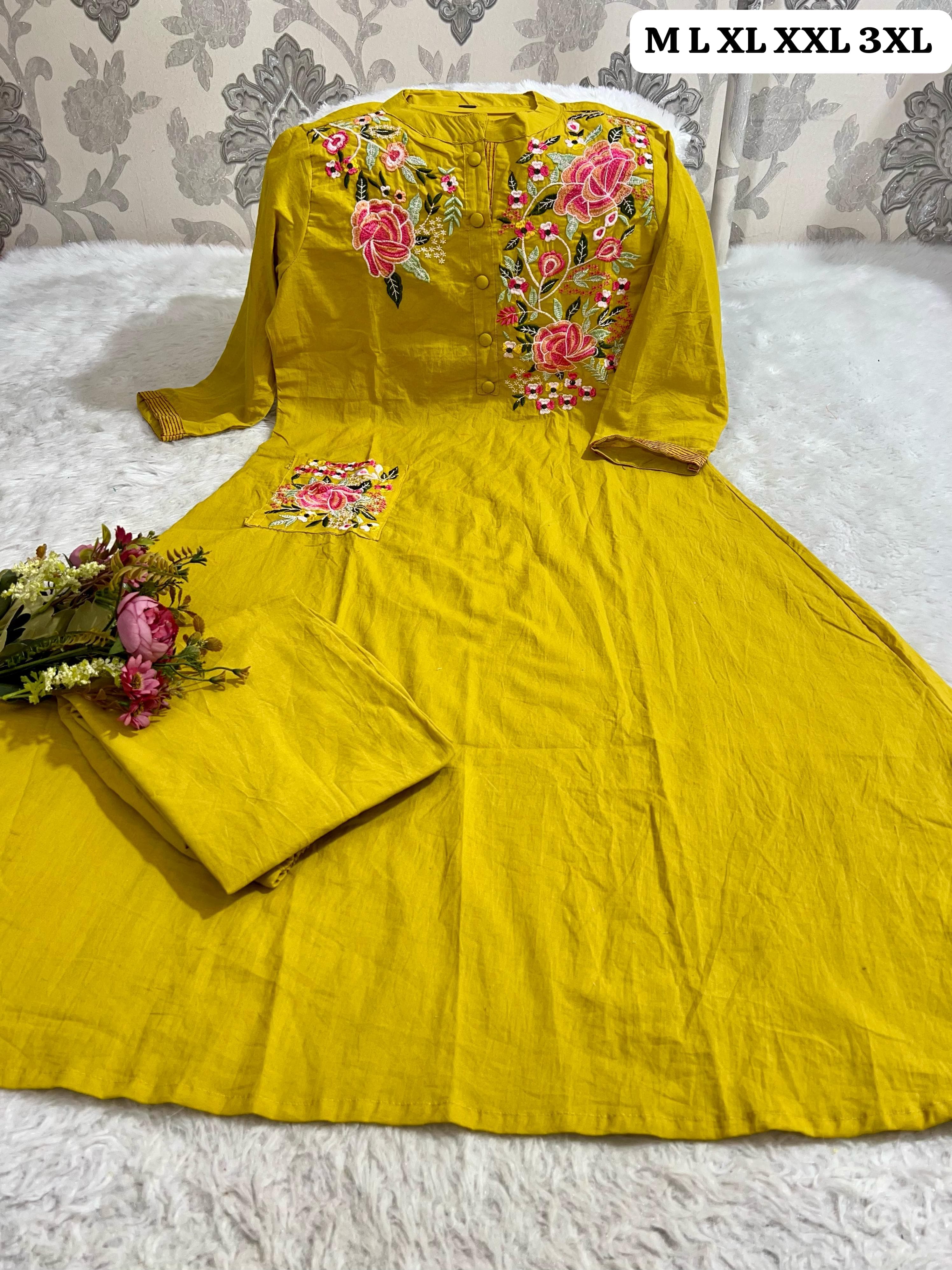 | Name : | SF 3JU Yellow Pure fine Cotton fabric Embroidery Work Kurti with Pant |