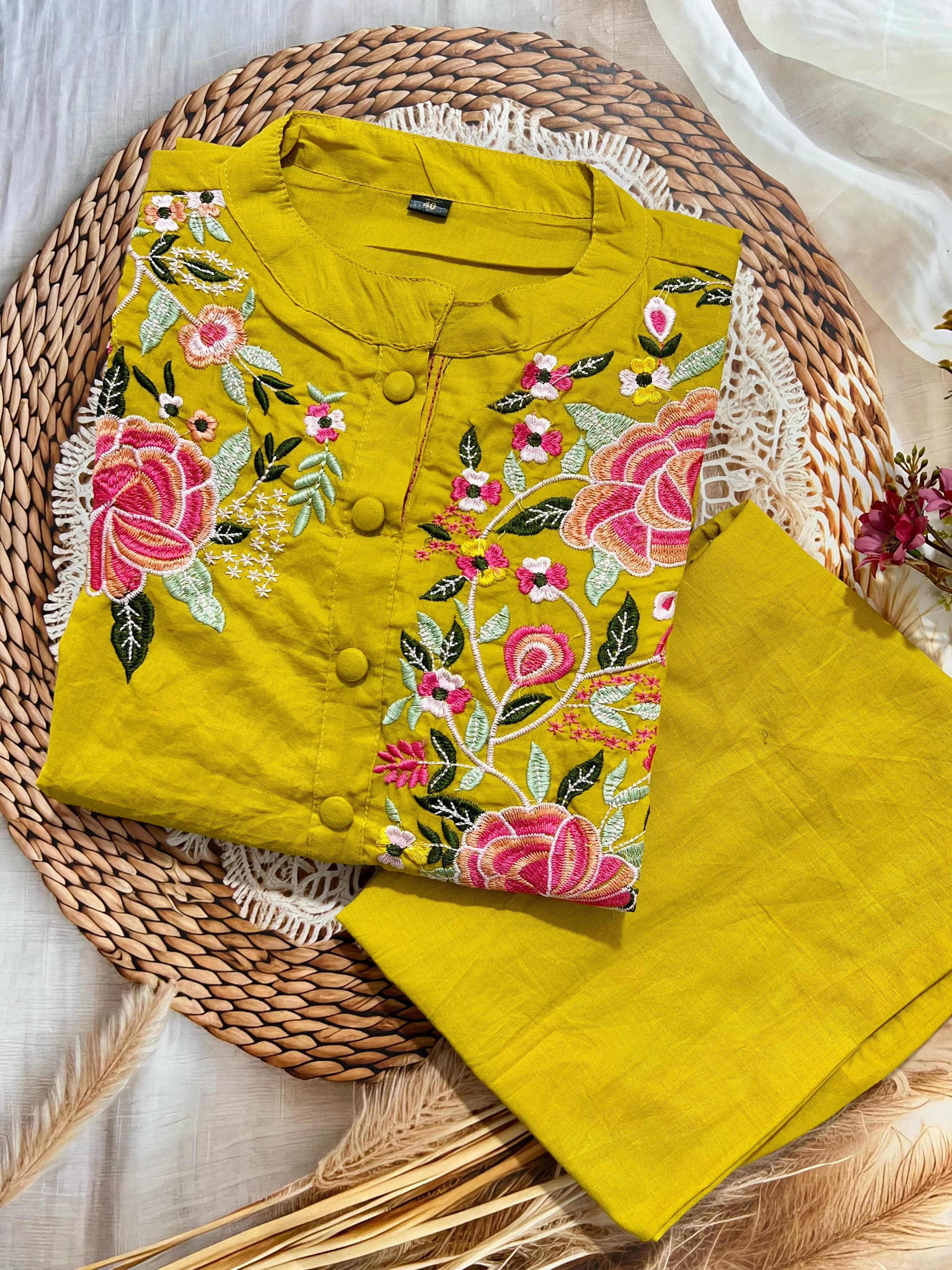 SF 3JU Yellow Pure fine Cotton fabric Embroidery Work Kurti with Pant